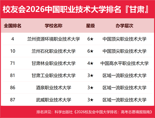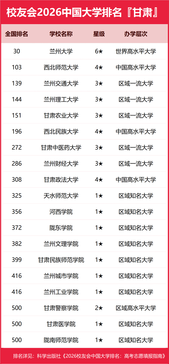 | 校友会2026甘肃省大学排名,兰州大学、兰州工商学院、兰州资源环境职业技术大学、平凉职业技术学院第一 |