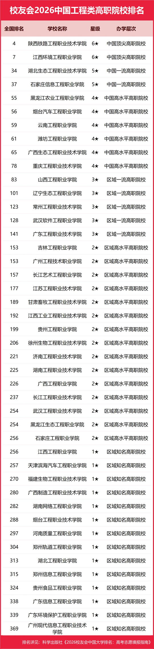 陕西铁路工程职业技术学院雄居2026中国工程类高职院校排名第一,江西环境工程职业学院跻身前3强