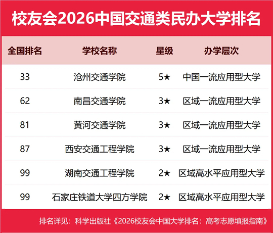 沧州交通学院雄居2026中国交通类民办大学排名第一,黄河交通学院跻身前10强