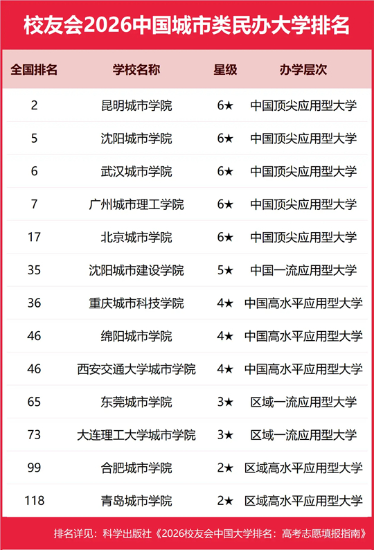 | 校友会2026中国城市类大学排名,香港城市大学(东莞)、昆明城市学院、武汉城市职业学院第一 |