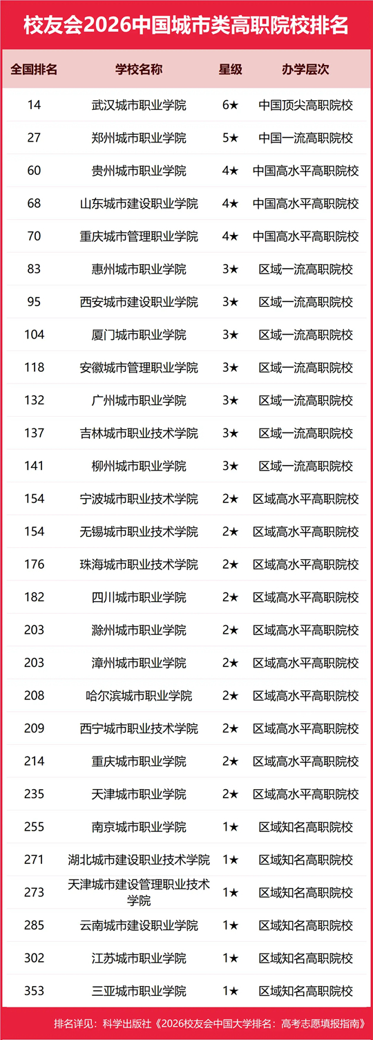 武汉城市职业学院雄居2026中国城市类高职院校排名第一,郑州城市职业学院跻身前3强