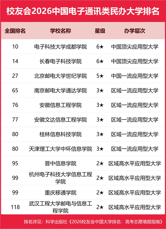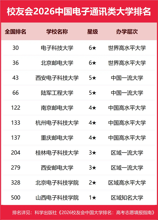 | 校友会2026中国电子通讯类大学排名,电子科技大学、电子科技大学成都学院、石家庄信息工程职业学院第一 |