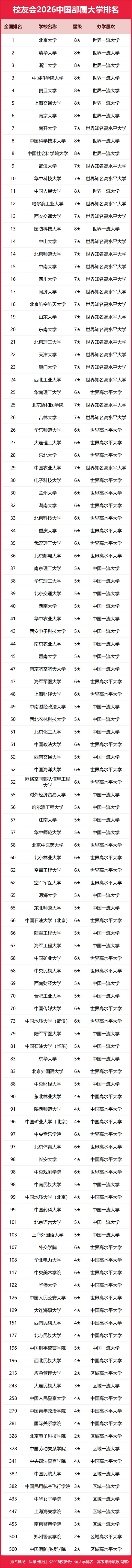 为了给2026年全国高考考生报考部属高校提供参考指南,2026年1月12日,全国第三方大学评价机构艾瑞深校友会网(Cuaa.net)撰写完成、科学出版社即将出版的《2026校友会中国大学排名:高考志愿填报指南》公布校友会2026中国部属大学排名。