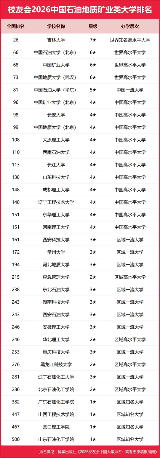 在最新校友会2026中国大学排名中,吉林大学全国排名第26名,雄居2026中国石油地质矿业类大学排名第一。中国石油大学(北京)第2,中国矿业大学第3。名列前10强的其他高校为中国地质大学(武汉)、中国石油大学(华东)、中国矿业大学(北京)、长安大学、中国地质大学(北京)、太原理工大学、西南石油大学。