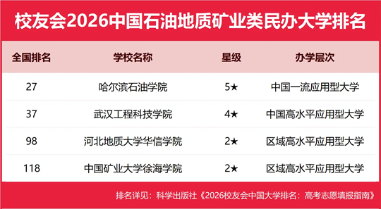 哈尔滨石油学院雄居2026中国石油地质矿业类民办大学排名第一,河北地质大学华信学院跻身前10强