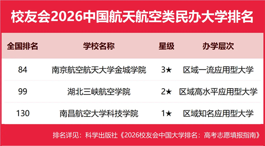 南京航空航天大学金城学院雄居2026中国航天航空类民办大学排名第一,南昌航空大学科技学院跻身前10强