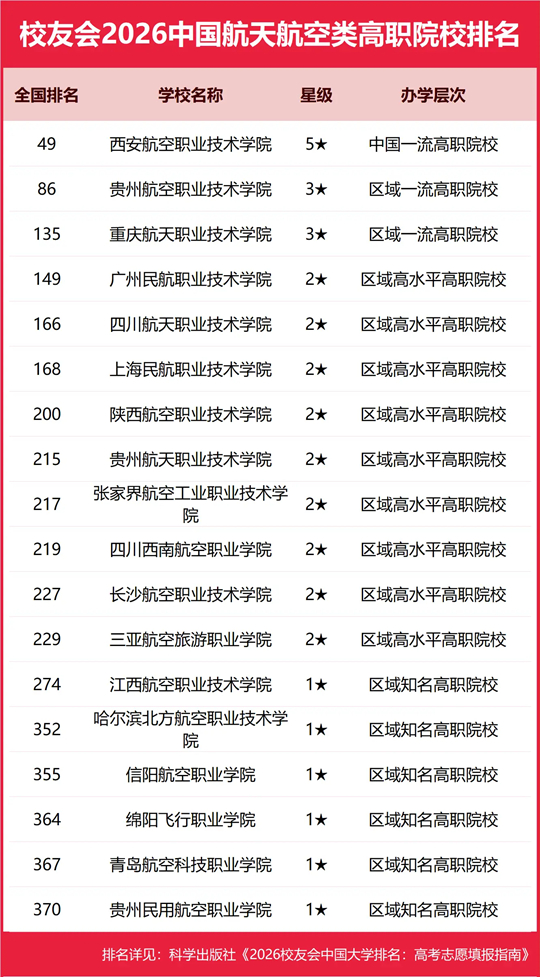 西安航空职业技术学院雄居2026中国航天航空类高职院校排名第一,贵州航空职业技术学院跻身前3强