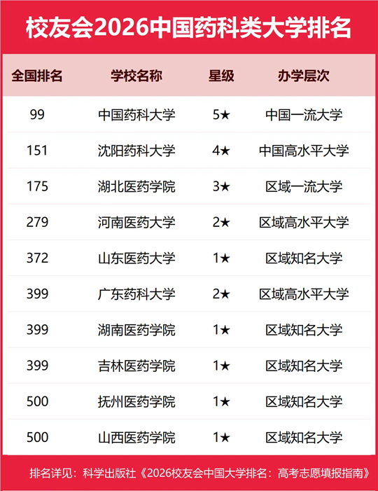 | 校友会2026中国药科类大学排名,中国药科大学、湖北医药学院药护学院、浙江药科职业大学、辽宁医药职业学院第一 |