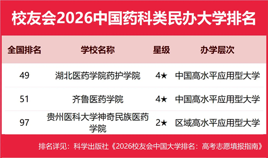 湖北医药学院药护学院雄居2026中国药科类民办大学排名第一,贵州医科大学神奇民族医药学院跻身前3强