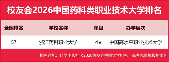在校友会2026中国职业技术大学排名中,浙江药科职业大学全国排名第57名,雄居2026中国药科类职业技术大学排名第一。