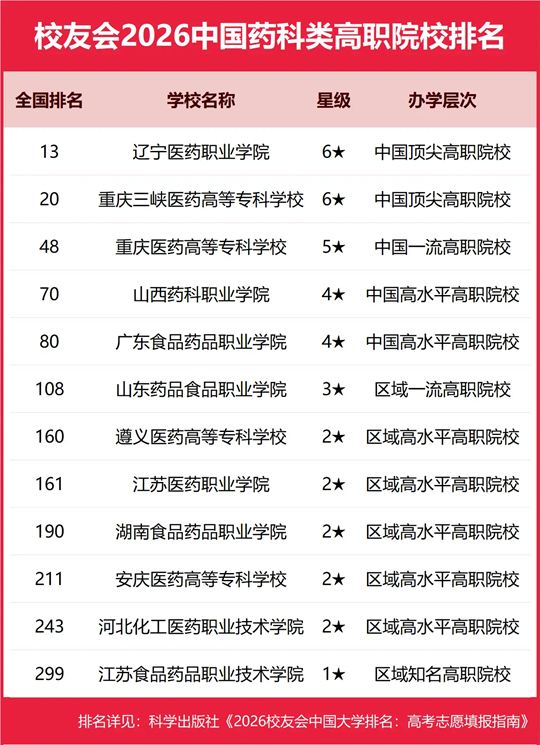 辽宁医药职业学院雄居2026中国药科类高职院校排名第一,重庆三峡医药高等专科学校跻身前3强