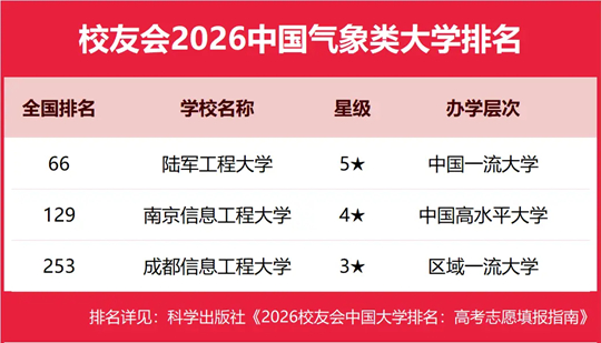 | 校友会2026中国气象类大学排名,陆军工程大学第一 |