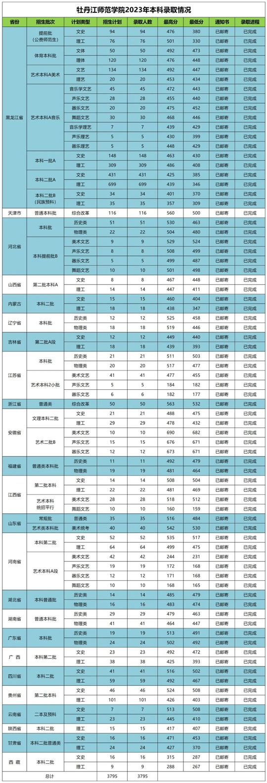 牡丹江师范学院现已完成2023年24个省、市、自治区,36个批次普通本科全部招生录取工作任务,圆满完成上级下达的3795人招生计划,具体情况如下: