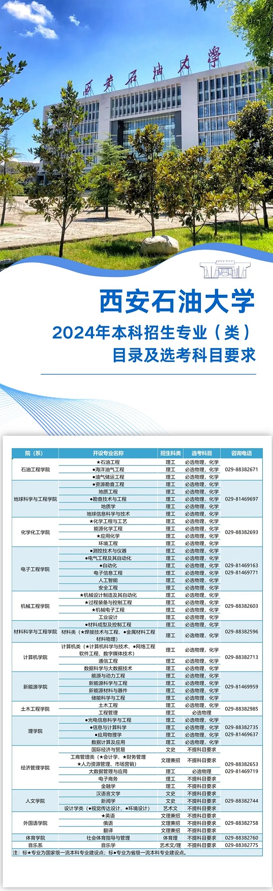 西安石油大学2024年本科招生专业(类)目录及选考科目要求
