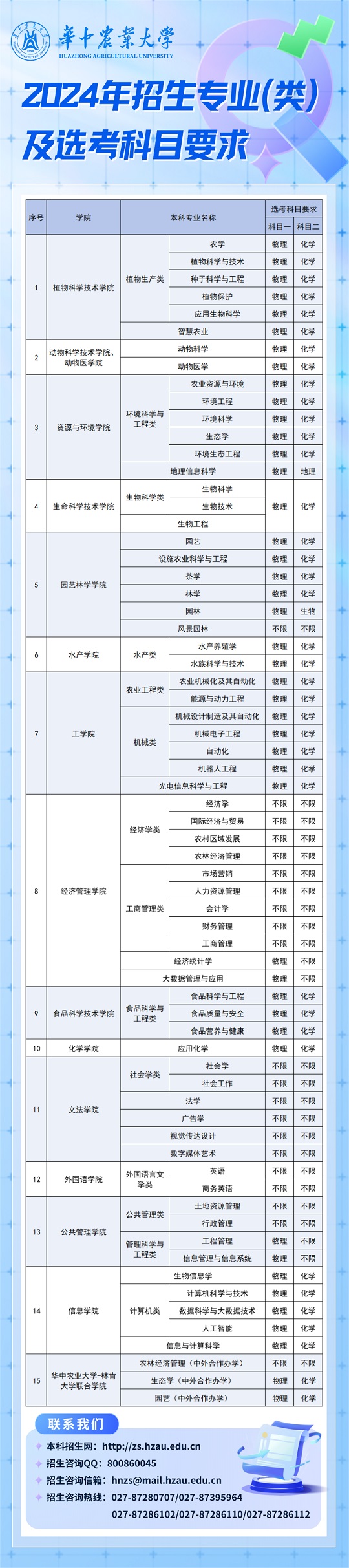 华中农业大学2024年招生专业(类)及选考科目要求