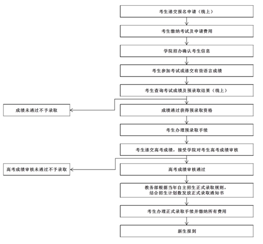参加学院组织的自主招生入学考试,成绩达到55分及以上(或有效期内的雅思成绩5.0分及以上)的考生,可获得学院自主招生预录取资格。