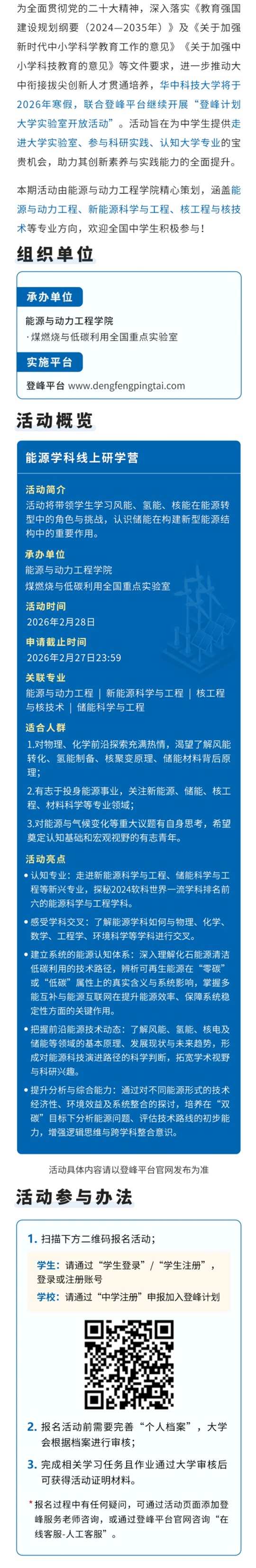 华中科技大学2026年寒假登峰计划大学实验室开放活动的报名通知
