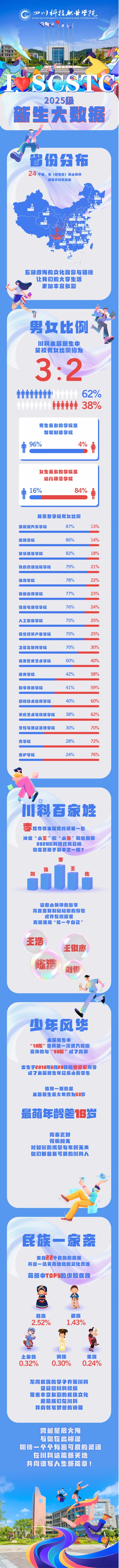2025级新生中,2007年、2008年出生的同学成为了绝对主体,标准的“05后”一代将以其独特的个性与创造力点亮川科校园。其中,年龄最小的新生出生于2010年,年仅15岁,可谓是少年英才;而年龄最大的新生则出生于1992年,追求梦想永远不晚!