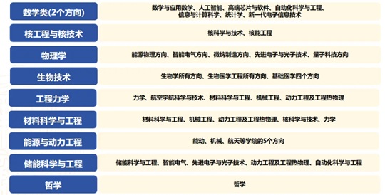 数学类(包含:数学与应用数学、信息与技术科学两个专业)、物理学、生物技术、核工程与核技术、工程力学、材料科学与工程、能源与动力工程、哲学,以及2026年新增的储能科学与工程专业。