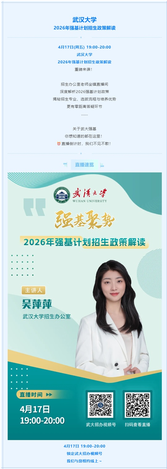 直播预告 | 4月17日武汉大学2026年强基计划招生政策解读