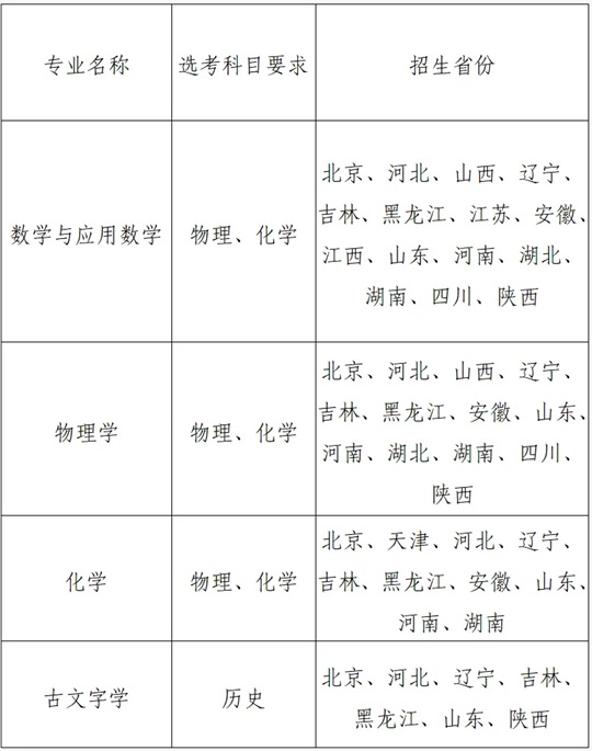 1.报考数学与应用数学专业、物理学专业、化学专业考生高考成绩(不含任何政策加分,下同)高于生源所在省公布的特殊类型招生录取最低控制分数线80分(含);报考古文字学专业考生高考成绩(不含任何政策加分,下同)高于生源所在省公布的特殊类型招生录取最低控制分数线60分(含)。