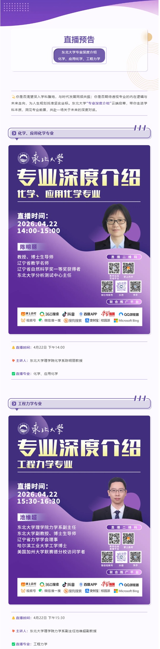 直播预告 | 4月22日东北大学专业深度介绍-化学、应用化学、工程力学