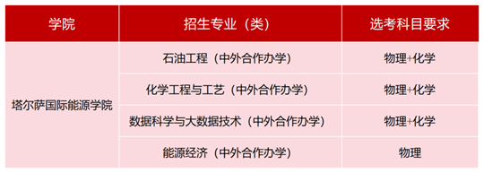 答:报考学院石油工程(中外合作办学)、化学工程与工艺(中外合作办学)、数据科学与大数据技术(中外合作办学)三个专业的考生,在高考改革省份须选择“物理+化学”科目;报考能源经济(中外合作办学)专业的考生须选择“物理”科目。非高考改革省份在理科类下填报志愿。