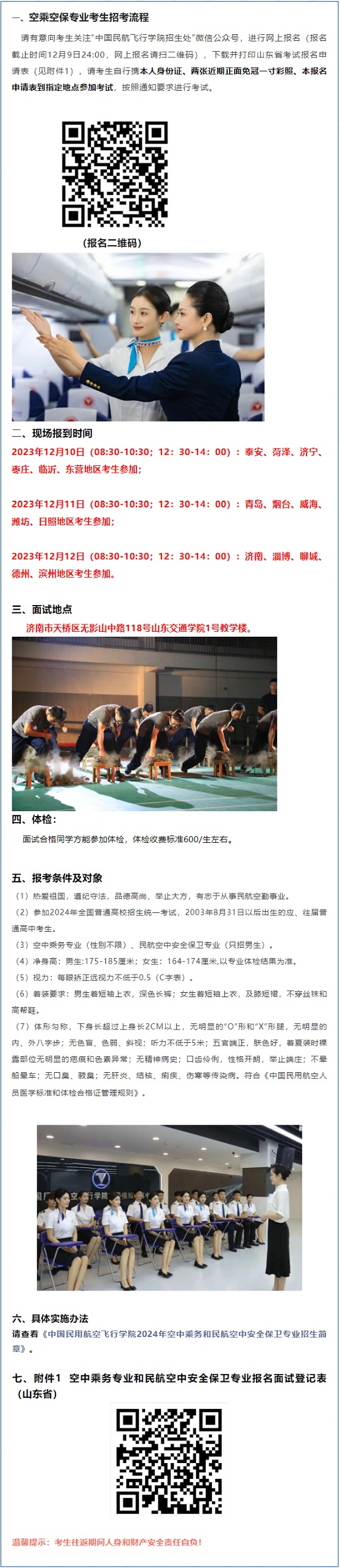 中国民用航空飞行学院2024年在山东省招收空中乘务和民航空中安全保卫专业学生通知