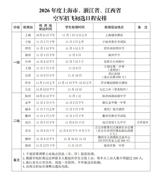 根据2026年度空军招飞工作安排,11月1日至11月13日,空军招飞局南京选拔中心将派初选组在上海市、浙江省、江西省各地市设站对报考空军飞行学员的军校生、高中生进行检测。