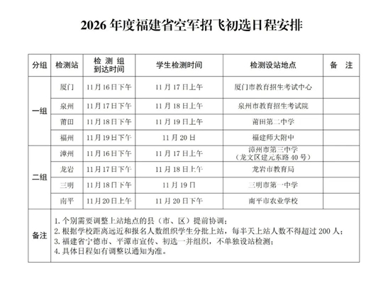 根据2026年度空军招飞工作安排,11月17日至11月20日,空军招飞局南京选拔中心将派初选组赴福建省各地市对报考空军飞行学员的学生进行检测。