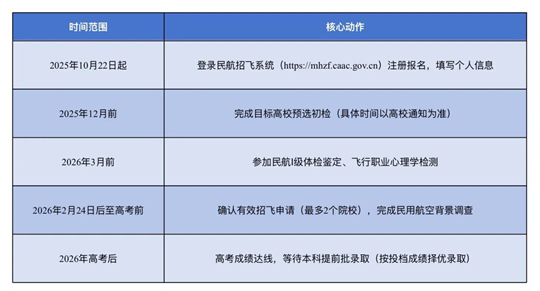 报考民航招飞的考生均须参加统一高考。高考报名、填报志愿、普通体检与其他考生同步进行。面试、体检及背景调查合格的考生须填报高考志愿,在本科提前批普通类A段录取。如果考生参加招飞未被录取,不影响填报的其他院校、专业志愿的正常录取。已被录取考生不再参加所报其他志愿的录取。