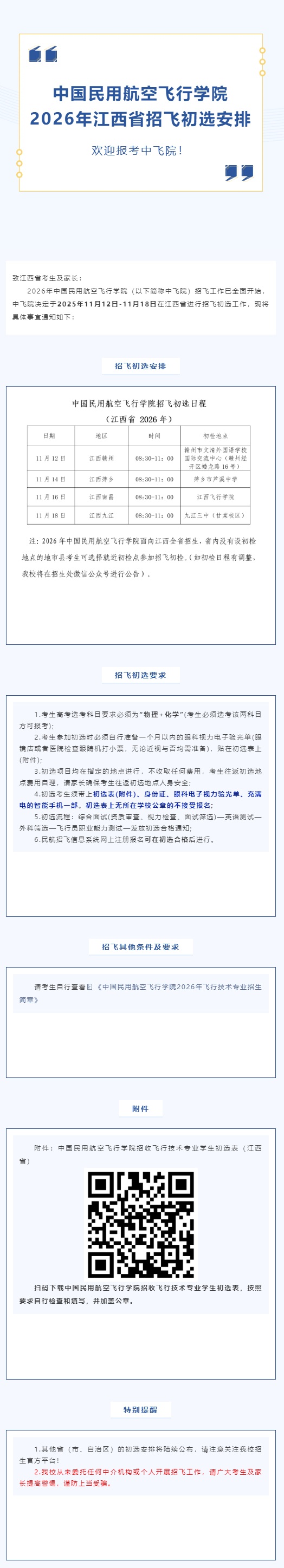 中国民用航空飞行学院2026年江西省招飞初选安排