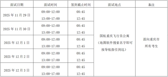 1.仅接受参加国航重庆地区线上初检合格且在国航招飞管理平台完成面试预约的考生参加面试,面试流程为:签到(预约时间前15分钟停止签到)—身高体重复测—飞行职业能力倾向测试—英语能力测试—集中面试,每名考生考核及等候时间约为4小时,请考生合理安排出行计划。