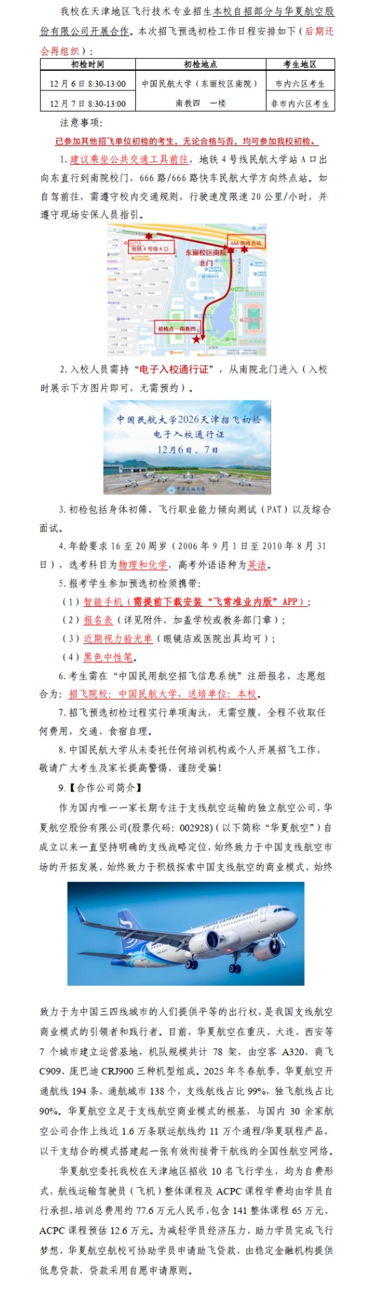 中国民航大学:天津地区2026年招飞预选初检安排(本校自招部分)-招飞信息网