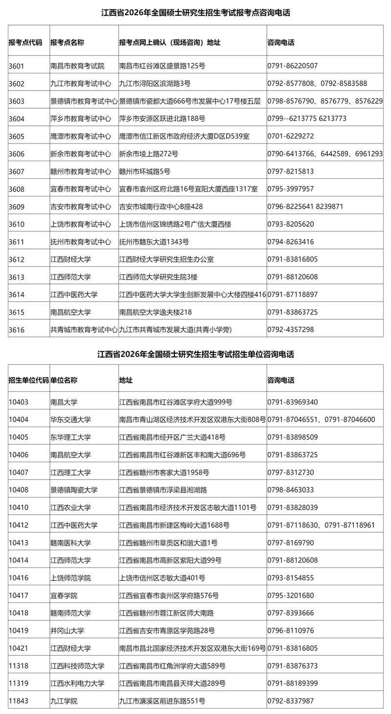 江西省2026年全国硕士研究生招生考试报考点和招生单位咨询电话