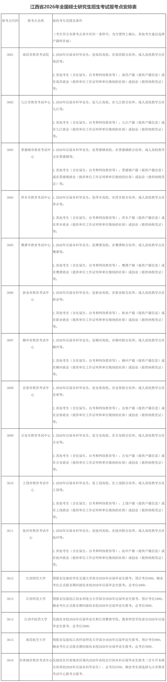 附件:江西省2026年全国硕士研究生招生考试报考点安排表