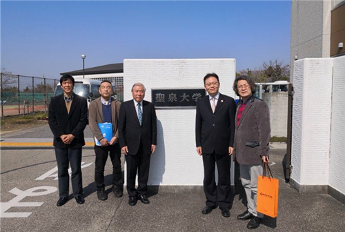 姜波理事长与圣泉大学事务局局长渡边长康、唐乐宁教授、松宫贵之教授合影留念