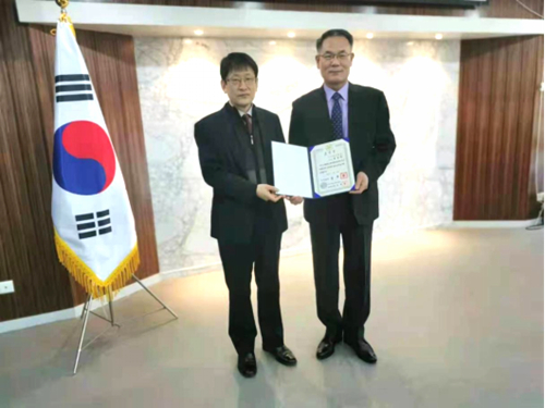 10月27日,韩国驻西安总领事馆先生代表韩国政府为韩国籍西安培华学院崔圣伯教授颁发了韩国国务总理奖状和奖章。