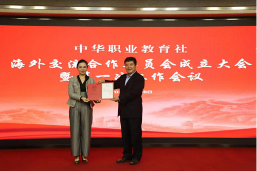 本次大会上,西安培华学院姜波理事长被特聘为中华职业教育社第十二届理事会海外交流合作委员会委员。西安培华学院国际交流中心王鹏主任代表姜波理事长接受聘用证书。