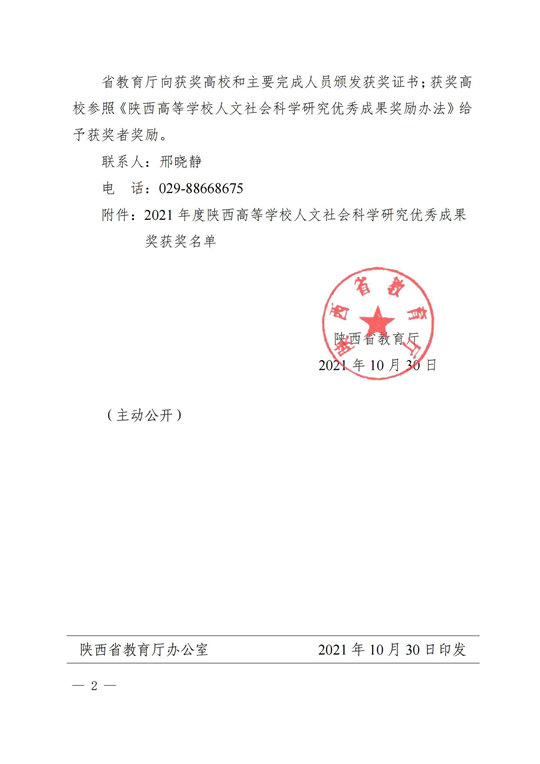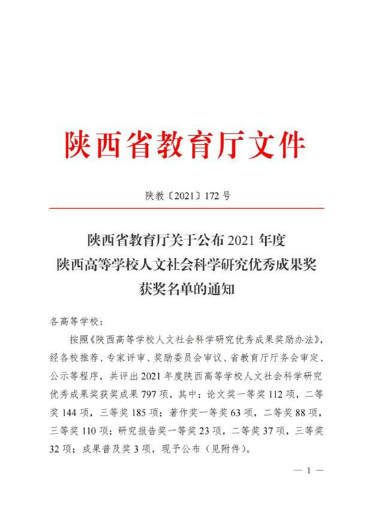 陕西省教育厅近日发布《陕西省教育厅关于公布2021年度陕西高等学校人文社会科学研究优秀成果奖获奖名单的通知》。经各校推荐、专家评审、奖励委员会审议、省教育厅厅务会审定、公示等程序,共评出2021年度陕西高等学校人文社会科学研究优秀成果奖获奖成果797项,其中:论文奖一等奖112项,二等奖144项,三等奖185项;著作奖一等奖63项,二等奖88项,三等奖110项;研究报告奖一等奖23项,二等奖37项,三等奖32项;成果普及奖3项。