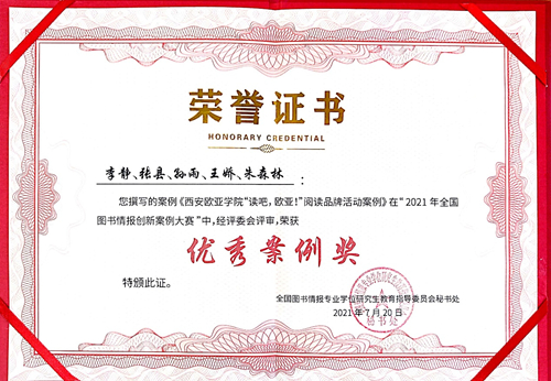 西安欧亚学院图文信息中心李静、张县、孙雨等提交的《“读吧,欧亚!”阅读品牌活动》案例获得2021年全国图书情报案例学术研讨会暨图书情报创新案例大赛优秀案例奖,也是此次获奖的唯一民办高校。