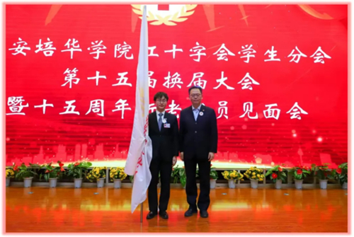 西安培华学院理事长、西安培华学院红十字会会长姜波为新任学生分会会长符永刚授旗