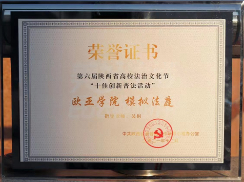 | 西安欧亚学院模拟法庭活动获第六届陕西省高校法治文化节“十佳创新普法活动”奖 |