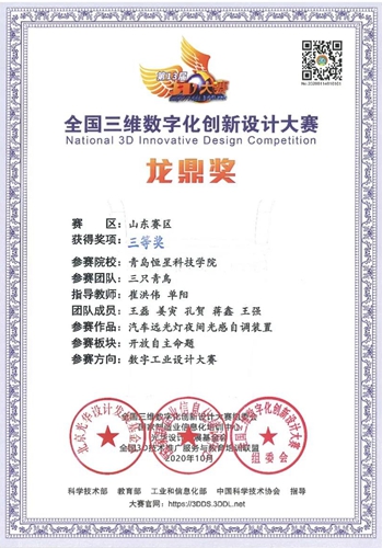 第十三届全国三维数字化创新设计大赛(简称:全国3D大赛),经过初赛和复赛的选拔。青岛恒星科技学院工学院两只队伍脱颖而出,再创佳绩。其中杜善威带领的一个队获得了山东赛区二等奖,王磊带领的一个队获得了山东赛区三等奖。