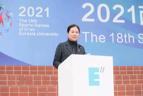 校长刘瑾教授致开幕词。她表示:“今年,恰逢全国第十四届全运会在陕西省举办,欧亚此次的运动会,不但是展示欧亚学子运动风采的嘉年华,更是发扬此次全运会“全民全运,同心同行”的精神风貌。崇尚体育精神、重视体育育人是学校多年来对学生发展理论研究和体育课程改革实践的结果。自2014年开始,学校体育与健康课程中心便尝试进行系统的课程改革,将传统意义上的体育课,转变为基于兴趣而组建的俱乐部。同学们在俱乐部中不仅能够培养一项终身受益的体育爱好,更会在老师们的指导下,参与俱乐部的管理、竞赛队伍的组织,并在管理和组织中锻炼自身的领导力。学校连续十一年开展了“四季欧亚”春季健康体育节活动,各青年社区也举办了校级体育联赛,越来越多的同学们参与到不同的体育运动中,“让运动成为生活方式”已经深入欧亚人的内心,并成为我们的生活态度和追求。预祝本次运动会圆满成功,预祝老师们和同学们都能在本届运动会中秉承着“更高、更快、更强”的体育精神,再创佳绩,并享受运动的快乐!”