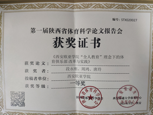 | 西安欧亚学院段永刚、周鸿、唐玲荣获第一届陕西省体育科学论文报告会一等奖 |