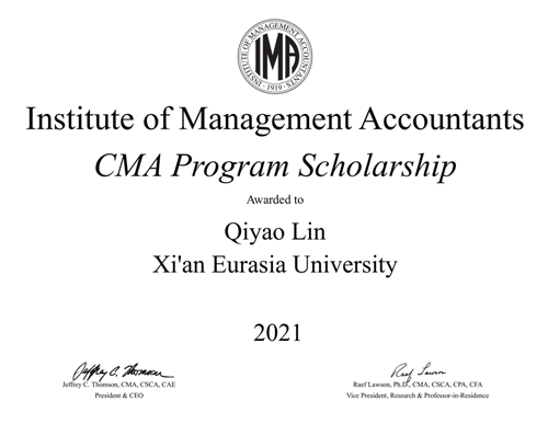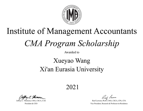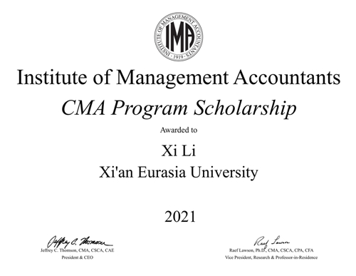 近期,由美国管理会计师协会(IMA)设立的CMA奖学金2021年度获奖名单揭晓,西安欧亚学院会计学院2018级财务管理专业黄玄、李茜、林祈瑶,2019级财务管理专业王雪遥荣获本年度该项目奖学金,将获得免费 CMA 学员注册和 CMA 考试的机会(等值约¥6000元)。这标志西安欧亚学院的管理会计国际化人才培养工作和教学质量获得了IMA的高度认可。同时,于2020年获得CMA奖学金的2017级财务管理专业高开先、沈铭敏已经顺利通过CMA全部阶段考试,在大四阶段收获CMA(美国注册管理会计师)证书。