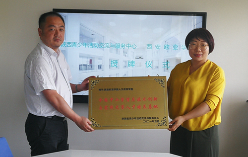 2021年6月2日,由陕西省青少年活动交流与服务中心、西安欧亚学院人文教育学院联合共建的“全国中小学信息技术创新与实践大赛人才培养基地”授牌仪式在西安欧亚学院北区教学楼举行。陕西省青少年活动交流与服务中心活动部部长冯川、西安欧亚学院人文教育学院副院长王丽霞共同揭牌,陕西省青少年活动交流与服务中心活动部副部长陈军,NOC大赛执行负责人朱俊玮,西安欧亚学院人文教育学院教师茆婷婷、贺甜甜、刘志琦参与见证。