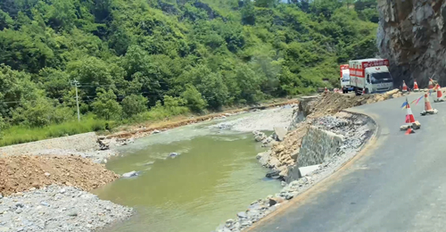 前往灾区的道路并不通达,出洛南县城沿242国道走不远,便可看到一处公路下面被洪水掏空,一座50米长的便民桥被冲得完全不见了踪影,只余下河中间的一个桥礅。一路走来发现多处路面遭水冲毁。行至石坡地界,经太阳暴晒后积满泥土的路面,车辆经过,尘土漫天。路的护栏及部分河堤也被洪水冲得扭曲变形。随处可见被冲毁的河堤和一块一块陷在河滩里的路面。