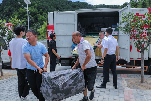 达到灾区后,在工作人员的指挥下,一行人顾不得一丝喘息,急迫的将物资搬卸至物资安置点。在得知有百余位被大水冲毁房屋的受灾群众仍集中在临时安置点,王卓理事长未做片刻停留便前往慰问。